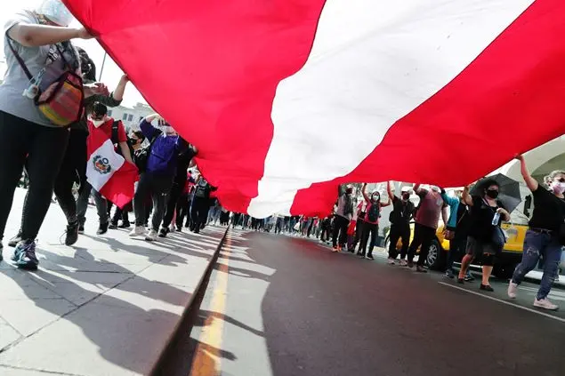 (Foto Reuters: manifestanti a sostegno dell'ex presidente Vizcarra con la bandiera peruviana, il 14 novembre a Lima)