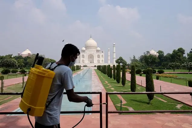 (Foto Reuters in alto: operazioni di sanificazione nel giorno della riapertura del Taj Mahal, in India)