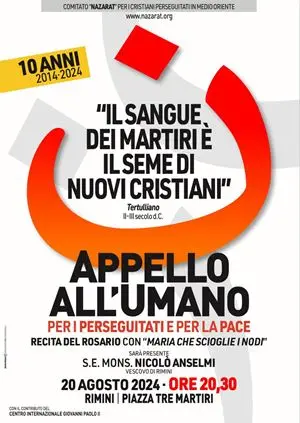 Rimini da due lustri non è solo nella “capitale del turismo” della Riviera, ma dalle sue piazze levano le preghiere di migliaia di persone per fermare la guerra in Medio Oriente. Era l’estate 2014, dopo poche settimane dalla proclamazione del Califfato, l’Isis prende il controllo di un ampio territorio fra Siria e Iraq e nella notte fra il 6 e il 7 agosto 125mila cristiani sono costretti ad abbandonare le loro terre e abitazioni dirigendosi verso il Kurdistan interno, mentre altri 110mila restano come rifugiati nella zona di Erbil e Duhok. Una persecuzione - per il tramite della violenza fisica e anche ecnomica - contro i cristiani. È allora che la sera del 20 agosto a Rimini, nella piazza centrale della città, alcune centinaia di persone si riuniscono a pregare il rosario per i cristiani perseguitati e ad ascoltare le testimonianze dei sopravvissuti a quegli avvenimenti. Da quella notte, ogni 20 del mese, l’iniziativa è proseguita non solo a Rimini, ma allargandosi via via ad altre tredici città italiane e alcune estere, con il coinvolgimento, inoltre, di ventisette fra monasteri e clausure d’Italia e d’Europa. Il prossimo 20 agosto 2024 segnerà i dieci anni dall’inizio di un gesto nato spontaneamente, un “appello all’umano” - come spiega il sottotitolo della manifestazione - che cerca di recuperare, con l‘intercessione della Vergine Maria, le ragioni per una convivenza, appunto, umana nel Medio Oriente percorso da divisioni etnico-religiose, violenze, guerre, oggi purtroppo ancora più gravi e apparentemente insanabili.