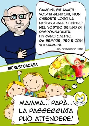Un don Fortunato disegnato in stile fumetto che si rivolge direttamente ai piccoli lettori invitandoli a non chiedere ai genitori “la passeggiata” fuori casa. E che poi continua: “Confido nel vostro senso di responsabilità. Un caro saluto. Da sempre, per e con voi bambini”. Chiusa la nuvoletta. Sotto, la vignetta è completata dall’invito di un gruppo di bimbi a mamme e papà: “La passeggiata può attendere”.