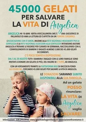 L’idea è quella di donare il corrispettivo di un gelato un gesto semplice, buono e gentile alla portata anche dei bambini e dei ragazzi. La proposta è infatti quella di rinunciare, in questa estate, a un cono gelato -ma chi se la sente anche di più- donando ad Angelica i 2 euro che si sarebbero spesi per l’acquisto. La raccolta delle donazioni durerà dal 5 al 20 agosto. L’idea è venuta all’Associazione Cor et Amor che si occupa di costruire gentilezza per il benessere delle comunità locali, mettendo al centro i bambini, educandoli alla gentilezza e proteggendoli con la gentilezza. Impiega, inoltre, strumenti come i Giochi della Gentilezza, sensibilizza i cittadini con la Giornata Nazionale dei Giochi della Gentilezza (22 Settembre) e crea ruoli sociali quali gli Assessori alla Gentilezza e gli Insegnanti per la Gentilezza che volontariamente si impegnano a diffondere gentilezza rispettivamente nelle comunità locali e in quelle scolastiche. E proprio nel suo paese esiste l’assessore alla gentilezza, nella persona di Miriam Asmundo, che si è esposta in prima persona con un appello a favore di Angelica.