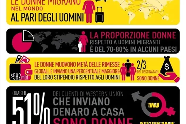 Se si guarda ai dati di Western Union, le donne rappresentano addirittura il 51% dei clienti del servizio di money transfer. Secondo l’Organizzazione Internazionale per le Migrazioni (Oim), anche se generalmente guadagnano meno degli uomini, le donne inviano una percentuale maggiore del loro reddito. Le donne, inoltre, inviano il denaro con maggiore regolarità e per un periodo di tempo più lungo nel loro ciclo di vita di immigrate.
