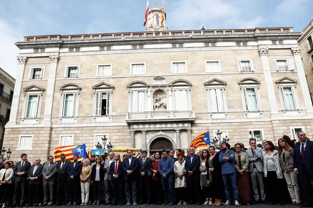 (Foto Reuters: il presidente della Catalogna Carles Puigdemont, il sidnaco di Barcellona Ada Colau al suo fianco e altri membri del Governo autonomo in plaza Sant Jaume, davanti alla sede della Generalitat, a Barcellona il 2 ottobre, il giorno dopo il referendum)