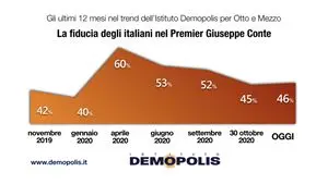 La “seconda ondata” della pandemia muove i consensi politici degli italiani. In calo, dopo i picchi dell’estate scorsa, la fiducia degli italiani nei confronti del premier Conte, ma anche delle Regioni. A segnarlo sono gli ultimi dati del Barometro Politico dell’Istituto Demopolis. La fiducia degli italiani nel Presidente del Consiglio è cresciuta in tre mesi di 20 punti, dal 40% del gennaio scorso al 60% di aprile, con Giuseppe Conte pienamente apprezzato per la sua risolutezza nella gestione della pandemia. Per poi decrescere al 52% di settembre e al 45% di fine ottobre, ed attestarsi oggi al 46%.