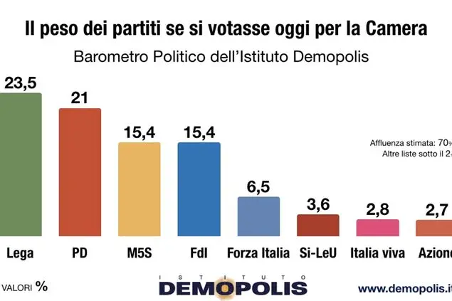 Secondo l’Istituto diretto da Pietro Vento, l’emergenza Covid ha influito anche sul peso dei partiti. Se si andasse oggi a votare alla Camera la Lega, sia pur in calo di consensi, resterebbe, con il 23,5%, primo partito nel Paese; il Partito Democratico avrebbe il 21%. Alla pari il Movimento 5 Stelle e Fratelli d’Italia, che otterrebbero il 15,4% Più distanti risultano Forza Italia al 6,5%, la Sinistra di LeU con il 3,6% e, di fatto appaiati, Italia Viva di Renzi al 2,8 e Azione di Calenda al 2,7.