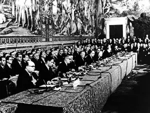 Era pomeriggio e pioveva a dirotto. Il 25 marzo 1957, un lunedì, la primavera non fece sconti a Roma. ai suoi ospiti e ai Trattati costitutivi della Comunità economica europea e della Comunità europea dell'energia atomica (la cui sigla, Ceea, ebbe minor fortuna di un'altra che prese subito sopravvento: Euratom). Scrosci brevi e intermittenti bagnavano le bandiere di Italia, Francia, Germania, Belgio, Olanda e Lussemburgo che facevano un po' di fatica a sventolare sul Palazzo dei Conservatori mentre le automobili delle delegazioni cominciarono ad arrivare davanti al Campidoglio attraverso un corridoio tenuto libero dagli agenti. Migliaia di romani cercavano di sbirciare tra le delegazioni dei grandi di un'Europa che prometteva di far dimenticare, se non i nazionalismi, almeno le macerie della guerra finita dodici anni prima. E, alle 18.00 in punto, i rintocchi della 'patarina', la storica campana del Campidoglio, risuonarono nella piazza michelangiolesca per annunciare l'inizio della cerimonia nella Sala degli Orazi e Curiazi. Le foto di quel giorno, in un bianco e nero un po' sbiadito, non ci rimandano il fasto del damascato rosso che ricopriva il lungo tavolo di noce dove i ministri e capi delegazione avevano preso posto. Ma la solennità, sessant'anni dopo, è intatta. E anche se quel giorno più che certezze c'erano punti interrogativi, il cantiere dell'Europa fu ufficialmente aperto.