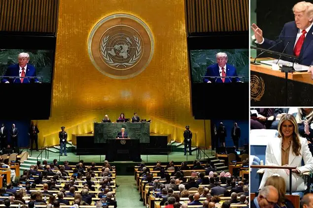 (Foto Ansa: Donald Trump durante il suo discorso all'Assemblea generale dell'Onu e la moglie Melania che lo ha accompagnato)