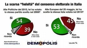Le Europee hanno dimostrato l’estrema variabilità del voto degli italiani, con un livello di fedeltà sempre più basso rispetto alle precedenti tornate elettorali. Se già nel 2013 soltanto il 54% aveva confermato l’opzione delle precedenti Politiche, il 25 maggio - secondo l’analisi dell’Istituto Demopolis - appena il 53% ha scelto lo stesso partito del febbraio 2013: il 45% degli italiani ha votato alle Europee una lista differente o è rimasto a casa.