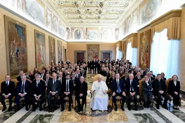 Cari fratelli e sorelle, buongiorno! Vi do il benvenuto, saluto Mons. Pompili e ciascuno di voi. Siete qui in occasione del Convegno che Vinitaly ha organizzato sul tema “L’economia di Francesco e il mondo del vino italiano”. Per numero di aziende coinvolte, qualità di produzione e impatto occupazionale, la vostra è certamente una realtà significativa, sia sulla scena vinicola italiana che internazionale, ed è dunque bene che vi ritroviate a riflettere insieme sugli aspetti etici e sulle responsabilità morali che tutto ciò comporta, e che in questo traiate ispirazione dal Poverello di Assisi. Le linee fondamentali su cui avete scelto di muovervi – attenzione all’ambiente, al lavoro e a sane abitudini di consumo – indicano un atteggiamento incentrato sul rispetto, a vari livelli. E il rispetto, nel vostro lavoro, è certamente fondamentale: per un prodotto di qualità, infatti, non basta l’applicazione di tecniche industriali e di logiche commerciali; la terra, la vite, i processi di coltivazione, fermentazione e stagionatura richiedono costanza, richiedono attenzione e richiedono pazienza. La sacra Scrittura stessa parla di questi temi. Viene in mente la Lettera di Giacomo, che dice: «Guardate l’agricoltore: egli aspetta con costanza il prezioso frutto della terra finché abbia ricevuto le prime e le ultime piogge» (Gc 5,7). E penso soprattutto a Gesù, il quale, nell’ultima immagine che lascia ai suoi discepoli, parla del Padre come di un agricoltore, che si prende cura della vite, potandola e facendo così in modo che porti buon frutto (cfr Gv 15,1-6). Rispetto, costanza, capacità di potare per portare frutto: sono messaggi preziosi per l’anima, che ben si apprendono dai ritmi della natura, dai vitigni e dalla lavorazione. Essa comporta un’infinità di competenze, solo in parte trasmissibili in modo tecnico, “scolastico”, spesso invece legate alla condivisione di una sapienza pratica, di vita, a un’esperienza specifica da acquisire sul campo, in modo tanto più proficuo, quanto più ci si lascia coinvolgere dalla dimensione umana di ciò che si fa. E se il rispetto e l’umanità valgono nell’uso della terra, sono ancora più decisivi nella gestione del lavoro, nella tutela delle persone e nel consumo dei prodotti, per far maturare, a livello di singoli e di aziende, quella capacità di «auto-trascendersi, infrangendo la coscienza isolata e l’autoreferenzialità», che «rende possibile ogni cura per gli altri e per l’ambiente», considerando «l’impatto provocato da ogni azione e da ogni decisione personale al di fuori di sé» (Lett. enc. Laudato si’, 208). Infatti, la «cura autentica della nostra stessa vita e delle nostre relazioni con la natura è inseparabile dalla fraternità, dalla giustizia e dalla fedeltà nei confronti degli altri» (ivi, 70). Cari amici, il vino, la terra, l’abilità agricola e l’attività imprenditoriale sono doni di Dio, ma non dimentichiamo che il Creatore li ha affidati a noi, alla nostra sensibilità e alla nostra onestà, perché ne facciamo, come dice la Scrittura, una vera fonte di gioia per «il cuore dell’uomo» (cfr Sal 104,15), e di ogni uomo, non solo di quelli che hanno più possibilità. Grazie allora per aver scelto di ispirare la vostra attività a sentimenti di concordia, aiuto ai più deboli e rispetto per il creato, sull’esempio di Francesco di Assisi. In lui vi benedico e vi auguro, nel suo stile, “pace e bene”. Grazie.