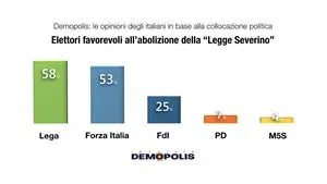 Sulla legge Severino, l’Istituto Demopolis rileva una netta polarizzazione delle posizioni politiche: favorevoli all’abolizione sono quasi 6 elettori su 10 della Lega, il 53% di chi vota Forza Italia. Il dato - secondo il sondaggio Demopolis per Otto e Mezzo - si riduce al 25% tra gli elettori di Fratelli d’Italia, crolla al 7 ed al 4%, rispettivamente tra chi vota il PD e il Movimento 5 Stelle.