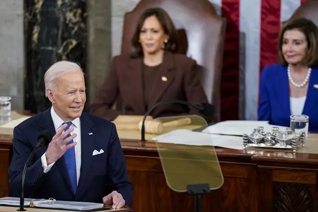 (nella foto, il presidente degli Stati Uniti Joe Biden mentre pronuncia il discorso sullo stato della Nazione al Congresso. Dietro di lui, da sinistra, la vicepresidente Kamala Harris e lo speaker Nancy Pelosi)