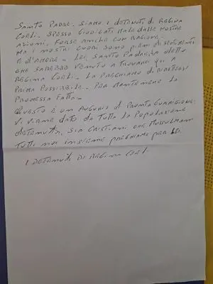 Anche i detenuti di Regina Coeli pregano per Papa Francesco. Lo hanno fatto con una lettera scritta a mano, letta durante la messa di domenica mattina nel penitenziario romano, e consegnata al cappellano, padre Vittorio Trani. Nella missiva, si uniscono detenuti cristiani e musulmani, per chiedere la veloce ripresa del pontefice che ha visitato il carcere di via della Lungara, nel centralissimo rione di Trastevere, il 29 marzo 2018, giovedì santo. Ai reclusi aveva confidato un suo problema di salute: la cataratta. E aveva usato, come sempre accade durante le visite di Francesco in carcere, parole di misericordia: «C’è gente che soffre, che è scartata dalla società, almeno per un tempo, e Gesù va lì a dirgli: ‘Tu sei importante per me’». Parole di affetto e vicinanza, che i detenuti non hanno dimenticato. E hanno ricambiato con la loro lettera. Eccola:
