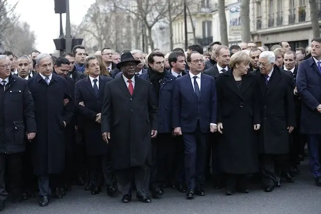 La Russia e l'Ucraina, Abu Mazen in prima fila con Benjamin Netanyahu, i leader di tutto il mondo (dall'Europa a Israele al mondo arabo), come un Quarto stato della libertà di espressione, marciano insieme per esprimere solidarietà a François Hollande e alla Francia ferita dai terroristi. Con loro cittadini di tutto il mondo, rappresentanti di tutte le religioni.