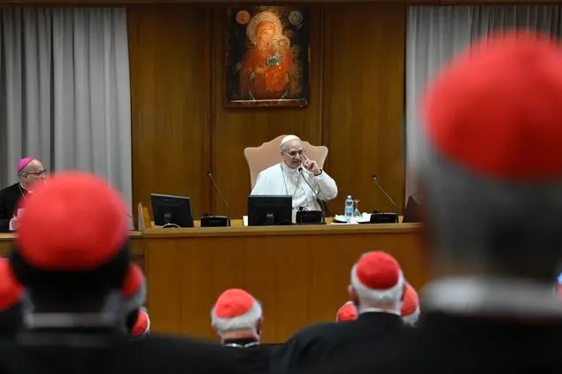 Un incontro di circa due ore, con un primo discorso di papa Leone XIV, in cui ha spiegato anche il perché della scelta del nome, e una seconda parte di discussione libera. Il nuovo Pontefice sceglie di cominciare il suo ministero incontrando di nuovo, dopo la messa celebrata ieri in Sistina, i cardinali. Lo fa ricordando che sono loro i primi ad aiutare il Pontefice nel gravoso peso di condurre la Chiesa, «gioco superiore alle mie forze come a quello di chiunque altro». Nelle parole di papa Prevost non solo il dolore per la scomparsa del suo predecessore, ma anche l’impegno a proseguire la sua opera. «Raccogliamo questa preziosa eredità e riprendiamo il cammino, animati dalla stessa speranza che viene dalla fede», sottolinea. Riprende i temi cari alla spiritualità agostiniana, l’essere umili servitori, e il senso di comunità. E riparte dal Concilio e dall’esortazione apostolica Evangelii gaudium di papa Francesco. «Vorrei che insieme, oggi, rinnovassimo la nostra piena adesione, in tale cammino, alla via che ormai da decenni la Chiesa universale sta percorrendo sulla scia del Concilio Vaticano II».
