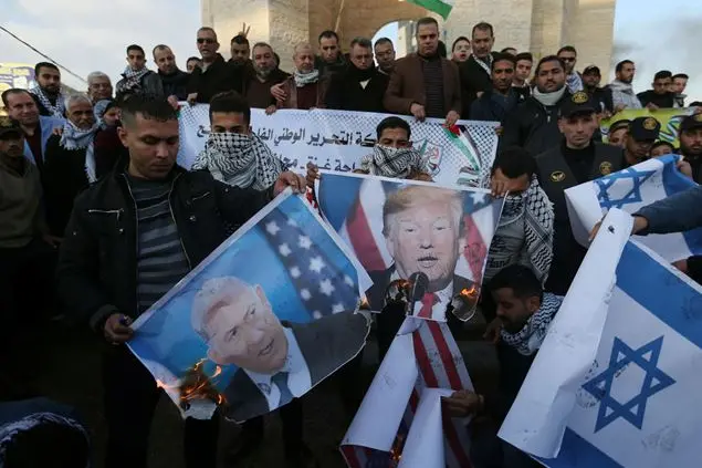 (Foto Reuters: palestinesi che protestano contro il presidente Usa Donald Trump e il premier israeliano Benjamin Netanyahu).