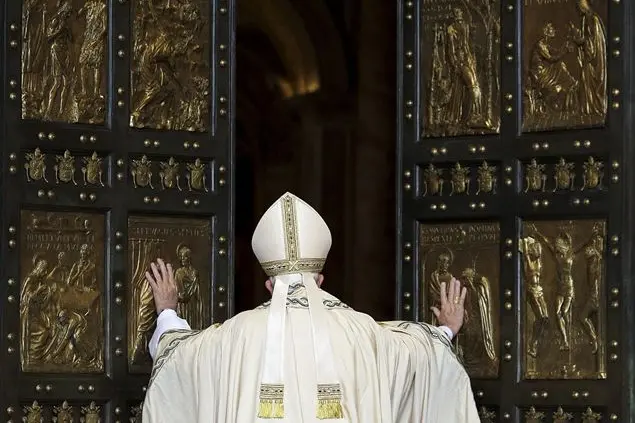 L'incontro caloroso con il papa emerito Benedetto. Poi la formula di rito: «Apritemi le porte della giustizia», «per la tua grande misericordia entrerò nella tua casa Signore». Papa Francesco ha inaugurato ufficialmente il Giubileo della misericordia spalancando la Porta Santa della basilica di San Pietro. Il mosaico di Petrus sovrasta la Porta mentre Bergoglio, con la croce a stile usata da Paolo VI e con il piviale che fu di Giovanni Paolo II, attraversa San Pietro fino all'altare. Benedetto XVI entra dopo di lui e di nuovo c'è l'incontro cordiale con Francesco.