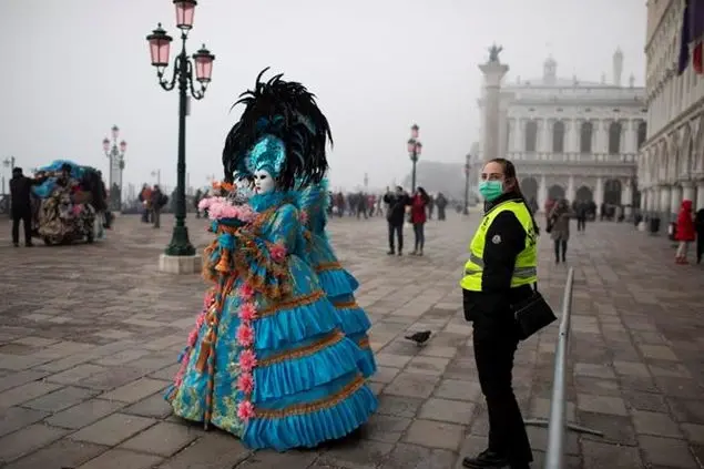 Il primo carnevale in mascherina sanitaria. Venezia ai tempi del coronavirus è anche questo. C’è un’aria surreale passeggiando tra calli e campielli poco affollati, in questo scampolo di carnevale, chiuso forzatamente anzitempo dall’ordinanza del governatore Zaia. La festa non è ancora finita, e la paura da contagio è già iniziata. Baute, tricorni e costumi sgargianti sfoggiati da turisti foresti si incrociano in Piazza San Marco con le mascherine indossate dai poliziotti, da qualche veneziano che ha deciso di non fidarsi del virus e da pochi visitatori con gli occhi a mandorla.