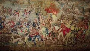 L’opera più importante con la Battaglia di Pavia come soggetto consta di sette grandi arazzi disegnati e intessuti nelle Fiandre dove lavoravano i più famosi artisti tessitori, e poi donati nel 1531 a Carlo V, a titolo di omaggio per il sovrano. Oggi sono conservati al museo di Capodimonte a Napoli, al momento si trovano in mostra negli Stati Uniti, ma arriveranno tutti per la prima volta in città per la mostra Pavia, 1525: la città, le arti, la battaglia,  dal 18 settembre 2025 al 20 gennaio, al Castello visconteo. È curioso il fatto a rendere subito evidente che sono opera di fiamminghi ci sono i tetti delle case pavesi che somigliano molto, troppo, a quelli spioventi del nord Europa. Altre opere dedicate alla Battaglia  si trovano al Royal Armouries Museum di Leeds, al National Museum di Stoccolma e all’Ashmolean di Oxford.