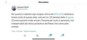 Insieme con il Sars cov2 c’è un altro virus che sta venendo allo scoperto. Quello di una cultura che considera le persone soltanto in base alla loro prestanza, efficienza, forma fisica, produttività. L’"infortunio linguistico", se vogliamo chiamarlo così, del presidente della Regione Liguria, Giovanni Toti che twitta «solo ieri tra i 25 decessi della Liguria 22 erano pazienti molto anziani. Persone per lo più in pensione, non indispensabili allo sforzo produttivo del Paese che vanno però tutelate», ha in realtà sintetizzato quello che via via sempre più persone vanno affermando. E cioè che per permettere ai giovani di continuare movida e vita quotidiana come se nulla fosse, gli anziani e le persone fragili andrebbero “tutelate” chiudendole in casa e impedendo loro ogni forma di mobilità. Tralasciando l’incostituzionalità che avrebbe un simile provvedimento (per altro già sottolineata dal presidente della Repubblica Sergio Mattarella quando la discussione si era affacciata nel primo lockdown) colpisce quanto stia attecchendo questa cultura dello scarto. Una cultura per cui le persone fragili, tanto più se in là negli anni sono considerate un peso, un costo, un freno per chi vuole continuare a correre senza limiti. Risuonano le parole di papa Francesco che, nel giorno dei Santi Pietro e Paolo, come già aveva fatto tante volte in passato, aveva chiesto di pensare ai «tanti anziani che sono lasciati soli dalla famiglia come se fossero materiale di scarto. La solitudine degli anziani è un dramma del nostro tempo».