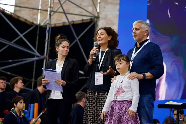 «La disabilità - ha detto nel suo discorso - quando arriva è tutta la famiglia che se ne deve occupare». Anche per questo Guido ha portato sul palco la sua famiglia: «Sono sposato con Daniela e genitore di Marta, che sta svolgendo il servizio civile con il CUAMM Medici con l’Africa in Etiopia, di Francesca e della piccola Anna, anzi grande perché ormai ha 10 anni. La disabilità non viene scelta, ma accade. Normalmente è una brutta notizia, ma chi si nasconde, la persona che si nasconde dietro è sempre una buona notizia. Qui sul palco vedete una disabilità esplicita che forse riconoscete dagli occhi a mandorla, ma ci sono tante altre disabilità che non vediamo e che possiamo scoprire reciprocamente in un solo modo: incontrandoci. La disabilità, oltre a tante fatiche, ha la particolarità di nascondere le persone e di nasconderci come persone e quando arriva in una famiglia coinvolge tutta la famiglia». Per questo Guido Marangoni ha ceduto la parola a Francesca, sorella di Anna che da sorella maggiore ha esordito così: «Vorrei condividere con tutti la bellezza nel vedere i coetanei di mia sorella Anna salutarla per strada, aiutarla quando non capisce qualcosa, aspettarla se ha bisogno di più tempo. Si perché per quanto queste azioni siano molto semplici purtroppo non sono scontate».