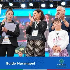 Sul palco di Assisi, a pochi metri dalla Basilica di San Francesco, Guido Marangoni chiude il suo intervento con un ringraziamento: «Grazie per questo G7 e per questo impegno esplicito nel trovare tempo e risorse per discutere e condividere ai vertici e insieme temi così importanti. Replico anche in questa sede un gioco che faccio sempre con i ragazzi nelle scuole per capire quanto parole come disabilità e inclusione appartengano ad ognuno di noi anche se spesso sono viste come “parole che riguardano gli altri”. Pensiamo il contrario di “inclusione”: è esclusione. Ora facciamo il gioco: vi invito a pensare per un istante ad un momento della vostra vita dove gli esclusi siete stati voi.