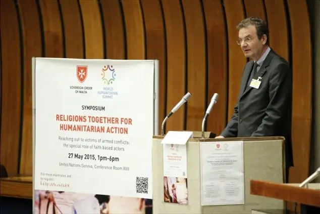 Il Simposio del 27 maggio 2015 a Ginevra, che riunisce leader di quattro confessioni, cristiana, ebrea, musulmana e buddista, e' frutto della collaborazione tra le Nazioni Unite, padrone di casa, e il sovrano Ordine di Malta, tra i protagonisti sulla scena mondiale e in particolare in Medio Oriente dei piu' importanti progetti di assistenza umanitaria, come sottolineato dal direttore della sede a Ginevra dell'Onu, Michael Moller.