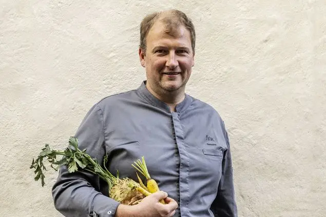 Oltre le grandi vetrate del Fink, una luce morbida e calda lascia intravedere anche la sala da pranzo interna dove i commensali siedono uno accanto all’altro su una panca lunga ventiquattro metri, rigorosamente scolpita nel legno. Petra si occupa di accoglierli con il sorriso (e di molto altro) mentre in cucina c’è suo marito Florian Fink, il trentanovenne chef brissinese ideatore di un’idea di cucina davvero molto innovativa. «Per me “l’arte culinaria monastica” è creare un sistema di lavoro autosufficiente com’è accaduto per secoli nei monasteri dove il cibo, dalla carne al pesce e dalle erbe alla frutta e verdura, era coltivato, allevato e trattato internamente dai monaci», dice Florian.