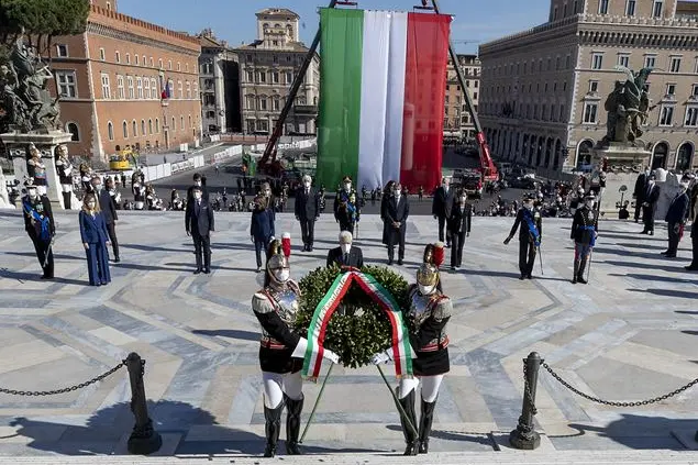 (Foto Ansa: il presidente Sergio Mattarella rende omaggio ai caduti all'Altare della Patria)
