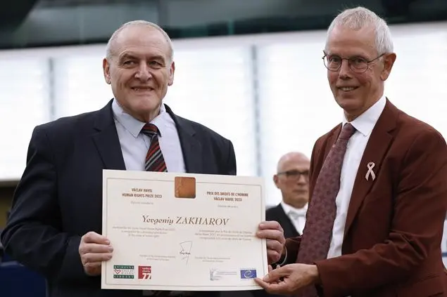 (Foto Ansa: Yevgeniy Zakharov riceve il Premio Vaclav Havel 2023 per i diritti umani da parte del presidente dell'Assemblea parlamentare del Consiglio d'Europa Tiny Kox)