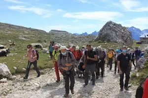 Sul cammino delle Dolomiti al seguito di Davide per sostenere l’impresa si sono messi poi in marcia quasi un centinaio di appassionati di montagna. Divisi in gruppi nel rigoroso rispetto delle misure anti-covid. In cammino sul sentiero delle Tre Cime, sugli stessi passi tracciati da Davide, c’erano venerdì anche i sindaci di Treviso, Mario Conte, di Trevignano (Treviso), Ruggero Feltrin e l’assessore alla cultura e ai servizi sociali del Comune di Auronzo (Belluno) Paola De Filippo Roia. “Davide sorride alle Tre Cime” è lo slogan scelto dalla grande squadra della solidarietà per la giornata: “Tutto questo non l’ho fatto da solo – ha detto Davide al termine dell’impresa - Ho avuto bisogno di chi mi ha accompagnato. Ho capito che siamo tutti bisognosi gli uni degli altri. C’è chi lo manifesta di più, non posso negarlo. Ma ognuno di noi, nessuno escluso, non va da nessuna parte da solo. Abbiamo tutti bisogno di accoglienza, di conforto, di qualcuno che ci dia fiducia. Abbiamo bisogno di sentirci parte di una comunità”. E sulle pareti della forcella Lavaredo, proprio grazie all’impresa di Davide, ha trovato posto pure una targa speciale. Che ricorda il passaggio di Papa Giovanni Paolo II, il papa santo con la montagna nel cuore: “Qui sostò in preghiera e meditazione il giorno 16 luglio 1996”, si legge nella targa che conclude con le parole di Karol Wojtyla: “Non abbiate paura”.