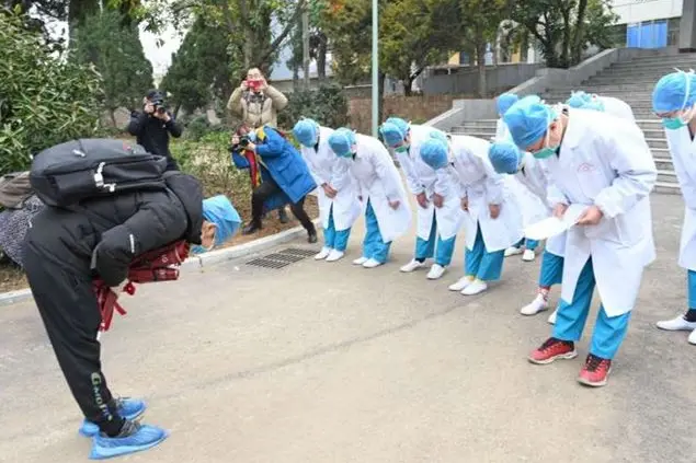 L’immagine arriva da un ospedale di Hainan, città della Cina orientale con oltre un milione di abitanti, nella provincia di Anhui. Mostra un paziente al momento delle dimissioni. L’uomo era stato ricoverato per una polmonite provocata dal coronavirus. Adesso l’uomo è guarito e al momento dell’uscita dall’ospedale egli ringrazia i medici che lo hanno curato con un inchino. Lo staff medico (nella foto contiamo almeno 9 persone) lo saluta a sua volta con un inchino. L’uomo guarito nell’ospedale di Hainan non è un’eccezione. Il “Quotidiano del Popolo”, organo di stampa ufficiale del Comitato Centrale del Partito comunista cinese, spiega che negli ultimi giorni sono stati dimessi altri due pazienti ricoverati nello stesso ospedale. Finora nella provincia di Anhui il virus COVID-19 ha provocato 6 morti, molti di meno rispetto al focolaio di Hubei (dove si contano 3.024 decessi).