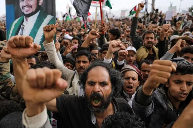 (Foto Reuters in alto: yemeniti Houthi manifestano per la popolazione palestinese di Gaza)