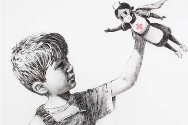 Un bambino gioca con i supereroi. I vecchi pupazzi giacciono nel cestino e lui tiene in mano e fa volare un'infermiera con il mantello e la mascherina. Così l'artista inglese Banksy (di cui nessuno conosce la vera identità), famoso per i murales e le opere a favore della pace e della giustizia sociale, rende omaggio al personale sanitario che anche nel Regno Unito sta lottando per salvare vite umane dalla pandemia. La nuova creazione, della grandezza di circa un metro quadrato, è apparsa appesa vicino al Pronto Soccorso dell'ospedale di Southampton nel Sud del Paese. Ha poi postato il nuovo disegno sul suo profilo Instagram che conta oltre otto milioni di follower.