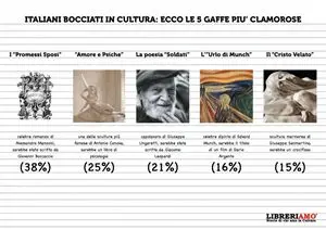 “L’urlo di Munch”? Un film di Dario Argento. Chi ha scritto “I Promessi Sposi”? Giovanni Boccaccio. Dove si trova il “Cenacolo” di Da Vinci? A Roma, vicino al Colosseo e lo ha dipinto Michelangelo, che avrebbe anche dipinto… la Gioconda! Un italiano su 2 (52%) si scopre “ignorante” in materia culturale e commette gaffe e strafalcioni da incubo. Non a caso la classifica Ipsos Mori ha inserito l’Italia nella top 10 dei Paesi più ignoranti del globo, l’unica insieme al Belgio nell’Unione Europea. Ma per quale motivo gli italiani non conoscono la storia dell’arte o la letteratura? Secondo gli esperti la causa principale è la scarsa propensione alla lettura (68%). Non a caso l’Ocse ha definito di recente cinque livelli di alfabetizzazione: analfabetismo totale, livello minimo ma insufficiente di comprensione/scrittura e successivi tre livelli di crescente capacità di comprensione. L’Italia è stata collocata sotto i primi due livelli, guadagnandosi l’ultimo posto della classifica, insieme alla Spagna. Ma a fronte di questi dati, quali sono i strafalcioni più clamorosi che commettono gli italiani nel campo culturale