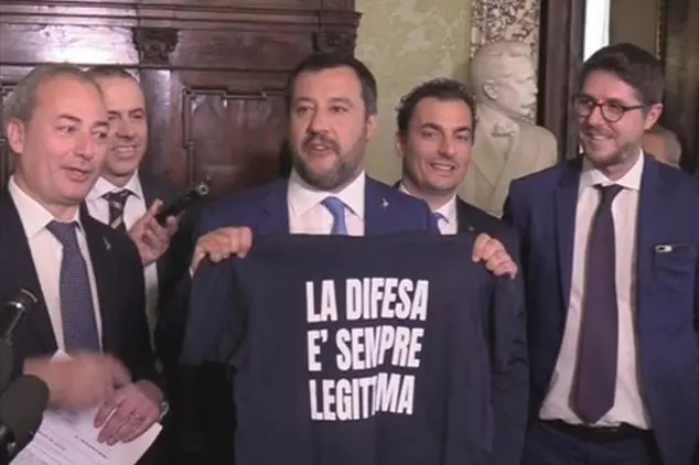 (nella foto: Matteo Salvini con la maglietta "La difesa è sempre legittima" dopo l'approvazione da parte del Senato dell'approvazione del ddl, Ansa)