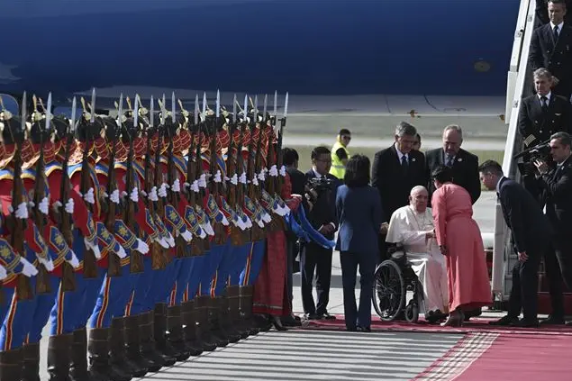 «Sii come il cielo». Con queste parole, un famoso poeta invitava a trascendere la caducità delle alterne vicende terrene, imitando la magnanimità ispirata proprio dall’immenso e terso cielo blu che si contempla in Mongolia. Anche noi, oggi, pellegrini e ospiti in questo Paese che tanto può offrire al mondo, desideriamo raccogliere tale invito, traducendolo in segni concreti di compassione, dialogo e progettualità comune. Possano le diverse componenti della società mongola, qui ben rappresentate, continuare a offrire al mondo la bellezza e la nobiltà di un popolo unico. Come la vostra scrittura, così possiate restare “in piedi” e sollevare tante sofferenze umane intorno a voi, ricordando a tutti la dignità di ogni essere umano, chiamato ad abitare la casa terrena abbracciando il cielo. Bayarlalaa! [grazie!].
