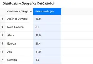 Il continente americano resta il principale bacino cattolico: il 27,4% dei fedeli vive in Sud America, il 13,8% in America centrale e il 6,6% in Nord America.