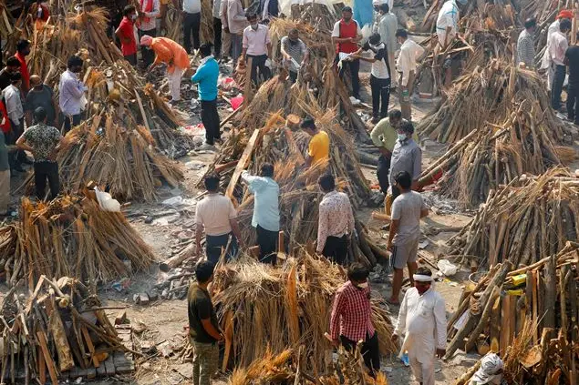 (Foto Reuters: cremazione di massa delle vittime del Covid a New Delhi)