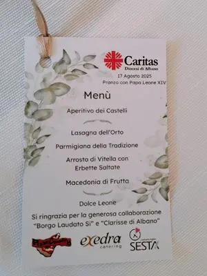 «Lei, Santità, ha scelto in questa domenica del suo soggiorno estivo a Castel Gandolfo di accogliere l’umile invito che Le abbiamo osato rivolgere: è qui a tavola con noi e ci ha fatto questo grande onore. Grazie! », ha detto il vescovo Vincenzo Viva nel suo saluto accogliendo papa Leone al pranzo a base di lasagna dell’orto, parmigiana, arrosto di vitella, macedonia e dolce Leone, un dolce crato per l’occasione, bianco e giallo con lo stemma papale, preparato con la collaborazione di Borgo Laudato si’ e delle Clarisse di Albano: «Non è una vicinanza formale o di circostanza, ma è una presenza che noi percepiamo come autentica, incoraggiante e piena di affetto paterno. È una presenza che ci dice come dobbiamo essere Chiesa anche oggi, seguendo l’esempio e l’insegnamento di Gesù, cioè accanto alle persone più vulnerabili, più deboli, ai piccoli e coloro che sono più feriti dalle circostanze della vita e della storia. Lei ci ricorda oggi, Santo Padre, che la carità, la diakonia, cioè il servizio fatto per amore e con amore, è il cuore pulsante della Chiesa e dell’evangelizzazione. Questo pranzo oggi è certamente un momento unico e storico, ma esso esprime ciò che ogni giorno noi cerchiamo di fare nei nostri Centri di ascolto e nelle opere-segno della Caritas: guardando i volti di chi oggi è seduto a questi tavoli, vediamo la bellezza del Vangelo che si fa vita concreta e testimonianza del nostro essere Chiesa di Albano. Non ci sono "noi" e "loro", non ci sono benefattori e beneficiari: ci sono persone che condividono il pane e, con esso, le proprie storie, le proprie fatiche, le proprie speranze. Nel lavoro di ogni giorno che si compie nella Caritas e in tanti altri luoghi di servizio caritativo della nostra diocesi di Albano, animati anche da tanti religiosi e diverse altre associazioni, cerchiamo di realizzare la vera comunione che il Vangelo ci insegna: è qui che la carità smette di essere un concetto astratto e diventa relazione autentica, ascolto e accompagnamento paziente che vogliono restituire soprattutto dignità e giustizia».