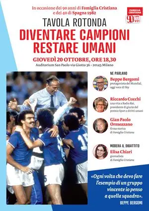 Basterebbero queste parole, contenute nella prefazione al libro Non è solo fatica, è amore, in uscita oggi per San Paolo a firma di Dario E. Viganò e Valerio A. Cassetta, per spiegare a chi si stupisce per quale ragione il 20 ottobre 2022, alle 18.30 all’Auditorium San Paolo, di via Giotto 36 a Milano, Famiglia Cristiana ha scelto di celebrare una tappa dei suoi 90 anni parlando di sport attorno a una tavola rotonda composta da Beppe Bergomi, campione del mondo sul campo con l’Italia 1982 a 18 anni, scusate se è poco; Riccardo Cucchi per anni voce di Tutto il calcio minuto per minuto e Gian Paolo Ormezzano, firma sportiva storica di Fc, moderati da Elisa Chiari. Il titolo dell’incontro “Diventare campioni, restare umani”, mette insieme le anime sedute al tavolo: Beppe Bergomi, colonna dell’Italia e dell’Inter, è certo l’unico a poter spiegare come si faccia a toccare il cielo dei propri sogni così giovani e a non perdere la testa. Gli altri due hanno osservato e raccontato lo sport per una vita da testimoni, scegliendo con cura le parole.