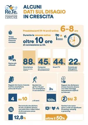 Secondo i dati raccolti dal Centro Studi della Fondazione Carolina, i preadolescenti tra gli 11 e i 14 annitrascorrono tra le 6 e le 8 ore online al giorno. Un numero che, durante le vacanze estive, sale vertiginosamente fino a superare le 10 ore. Per i ragazzi sopra i 14 anni, il tempo connesso può arrivare anche a 13 ore quotidiane. Videogame, contenuti in streaming, social media e messaggistica istantanea sono le attività più praticate – spesso concentrate nella fascia serale e notturna.