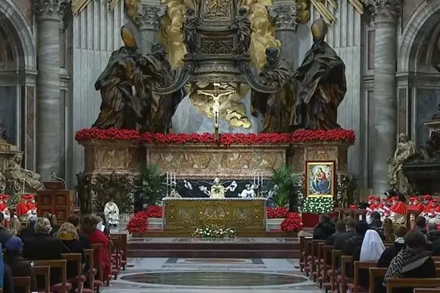 È stato il decano del collegio cardinalizio a leggere l’omelia preparata da papa Francesco per la celebrazione dei primi Vespri. Impossibilitato a celebrare e a guidare la preghiera del Te Deum per una dolorosa sciatalgia, Bergoglio ha affidato al cardinale Giovanni Battista Re le sue parole.