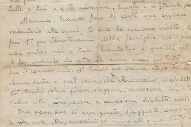 Ora che conosco la vita, ora che conosco il mondo, me ne sono accorto cosa sei tu. Nei momenti più tristi, più pericolosi, più angosciosi e malinconici della vita, solo tu sei il conforto, la speranza, la gioia di ogni cuore. In quei brutti momenti, ti vedo sempre davanti agli occhi, con la faccia sorridente e mi dici “coraggio” e allora non ho più paura, allora sono sicuro di me stesso e divento allegro e contento Nelle lunghe ore di riposo, insieme ai miei amici mi metto vicino alla stufa e con la testa fra le mani, penso lontano alla Patria, poi al paesello che una volta chiamavo maledetto e che ora tanto bramo, ed infine alla mamma, allora gli occhi diventano lucenti e vorrebbero tirar fuori tante e tante lacrime ma ci si trattiene per vergogna degli amici. Mi vedo piccolino attaccato alle tue vesti (bei tempi!), più grandicello quando ti aiutavo a fare qualcosa, più grande ancora, incominciavo a farti arrabbiare, ancora più grande e allora ti facevo soffrire, ero un mascalzone. Un mascalzone che ancora non conosceva l’amore della mamma. Ma ora so, comprendo e chiedo perdono del male fattoti. Ora non si viene più che per rivedere e riabbracciare la propria mamma e potergli stare vicino. E’ notte, sono smontato adesso di guardia e ho scelto questo momento per scrivere a te perché i miei amici dormono e non vedono le lacrime cadere dai miei occhi però so che anche tu, nel leggere queste poche righe e messe male, ma da un figlio forse un tempo ingrado (ingrato) ma che ha imparato ad amarti e conoscere il tuo amore verso di lui, anche tu verserai qualche lacrima. Mamma ti bacio chiedendoti la santa benedizione Tuo figlio Lello Chiedo perdono anche al babbo che anche lui sebbene in questa lettera non ne parli, ha saputo darmi una vera educazione e ha saputo rimproverarmi e sculacciarmi nei momenti propizi . Baci a tutti e due ….vostro figlio…. Vi ho sempre amati ma mai come ora.