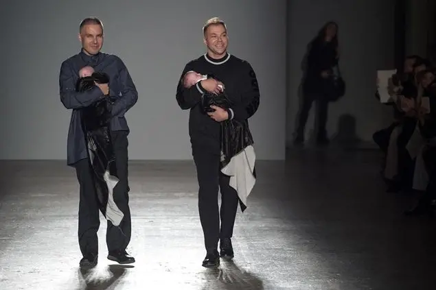 Due neonate avvolte in un drappo di seta nera e tenute in braccio, i flash dei fotografi, gli applausi del pubblico e per gradire, tra sete e velluti, sotto forma di stampa, ci sono anche le lastre delle prime ecografie. Sottotitolo: «La casa delle bambole». Le immagini dello stilista russo Sergei Grinko e del suo compagno Filippo Cocchetti che calcano le passerelle milanesi in apertura della settimana della moda tenendo in braccio le loro bimbe di un mese, Emma e Sophia, nate con l’utero in affitto in Messico a novembre, hanno già fatto il giro del mondo suscitando il plauso dei media mainstream: «fiocco rossa sulle passerelle milanesi», «orgoglio e gioia pura per la paternità, al di là di ogni speculazione».