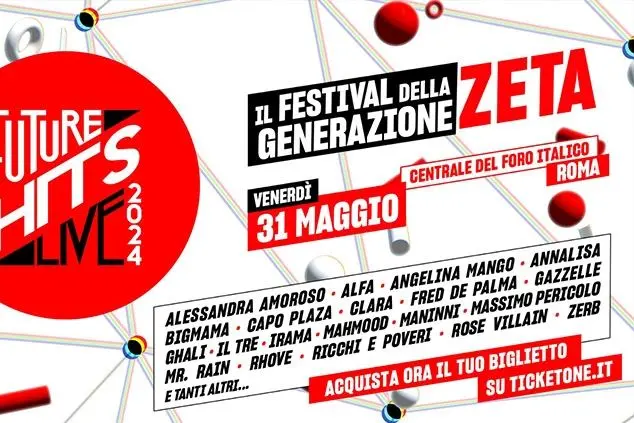 Inizia a prendere forma la line-up del Radio Zeta Future Hits Live - il Festival della Generazione Zeta. Ospite di Radio Zetae RTL 102.5. I primi nomi annunciati sono : Alessandra Amoroso, Alfa, Angelina Mango, Annalisa, BigMama, Capo Plaza, Clara, Fred De Palma, Gazzelle, Ghali, Il Tre, Irama, Mahmood,Maninni, Massimo Pericolo, Mr.Rain, Rhove, Ricchi e Poveri, Rose Villain, Zerb. L’hashtag ufficiale del Radio Zeta Future Hits Live è: #radiozetaFHL24