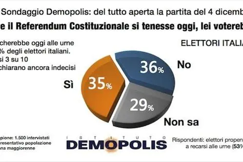"Se il Referendum si tenesse oggi, escludendo un altissimo numero di astensionisti ed indecisi, direbbe “sì” alla Riforma un italiano su due", spiega il direttore dell'Istituto Pietro Vento."Con un’affluenza al 53% e quasi 3 cittadini su 10 che non hanno ancora deciso, il Sì si attesta al 35 per cento; il No al 36 per cento".