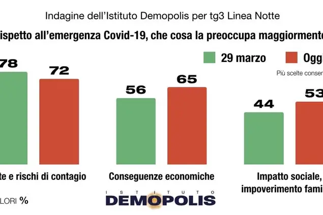 A distanza di un mese resta alta la preoccupazione degli italiani per la diffusione del Coronavirus nel nostro Paese. Questo il primo dato che emerge dalla nuova indagine realizzata dall’Istituto Demopolis, diretto da Pietro Vento (per il tg3 “Linea Notte”). Ai timori per la salute, che si confermano ancora oggi prevalenti con il 72% rispetto al precedente 78%, si sommano ormai da settimane forti preoccupazioni economiche, indicate da una percentuale crescente di cittadini (65%) e sociali riguardanti in modo particolare l’impoverimento delle famiglie (53%).