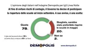 Molto larga, secondo i dati di Demopolis, appare la sintonia dell’opinione pubblica rispetto alla scelta di posticipare il rientro in classe degli studenti. Con l’eccezione degli esami di Stato, il 78% apprezza la decisione di posticipare a settembre la riapertura delle scuole. La pensa diversamente appena un quinto degli intervistati, propenso a una ripresa già nel mese di maggio. Con una interessante distinzione geografica: l’adesione alla scelta del governo è quasi plebiscitaria al Centro-sud (90%), mentre al Nord a condividere il rinvio a settembre è il 65%.