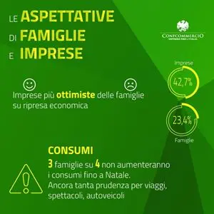 L’indagine di Confcommercio dice che sul fronte delle famiglie, invece, crescono i timori per un possibile calo dei redditi (per l’80% del campione) e dei risparmi (68,5%) e le previsioni di spesa negli ultimi mesi dell’anno indicano una sostanziale stabilità dei consumi di beni e servizi (per il 75,5%) e prudenza per viaggi e vacanze, tempo libero (spettacoli, concerti, stadio) e autoveicoli. Il minore ottimismo rispetto alle realtà aziendali sulla ripresa economica risente maggiormente dei giudizi sulla situazione personale: le previsioni dell’andamento di redditi e risparmi, da qui a fine anno, sono ritenute prevalentemente stabili o addirittura in calo (i redditi per l’80% del campione, i risparmi per il 68,5%). Le previsioni di aumento sono, infatti, limitate a un quinto delle famiglie per i redditi e a quasi 1 famiglia su 3 per i risparmi.