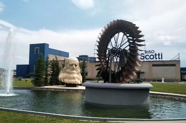 Natura, innovazione e progresso nel segno dell’acqua, risorsa vitale, imprescindibile, per la produzione del riso. Sono questi gli elementi che legano Leonardo da Vinci a Riso Scotti. L’azienda pavese si è ispirata al grande genio toscano per costruire il suo percorso di economia circolare, una filiera fondata sulla sostenibilità, dal campo alla tavola, con l’impegno nella riduzione dei consumi energetici, delle emissioni e degli scarti. A suggellare questo legame, all’interno del giardino del polo industriale Riso Scotti, con il patrocinio del Comune di Pavia, è stata installata in modo permanente – e può essere visitata – una gigantesca scultura di Leonardo, posta accanto alla grande ruota idraulica dell’Ottocento. L’opera, frutto del sodalizio artistico di Eleonora Francioni e Antonio Mastromarino, è stata realizzata in idroresina con struttura portante in acciaio, raffigura il ritratto senile dell’inventore e supera i quattro metri di altezza.